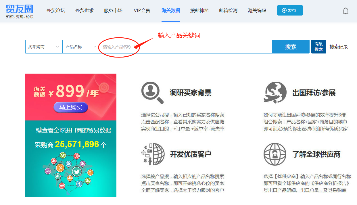 方法一:打开“贸友圈”选择“找采购商”——“产品名称”——输入产品关键词(英文或者小语种)