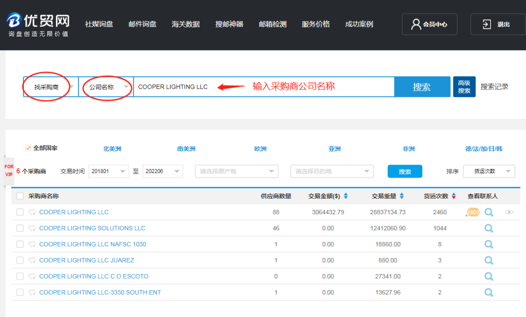 方法二:输入采购商的名称查询;如COOPER LIGHTING LLC(简称)