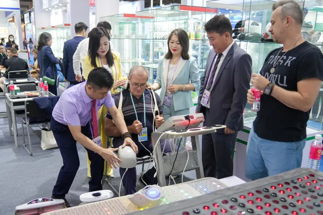 一名境外采购商在参展商的帮助下体验一款理疗仪