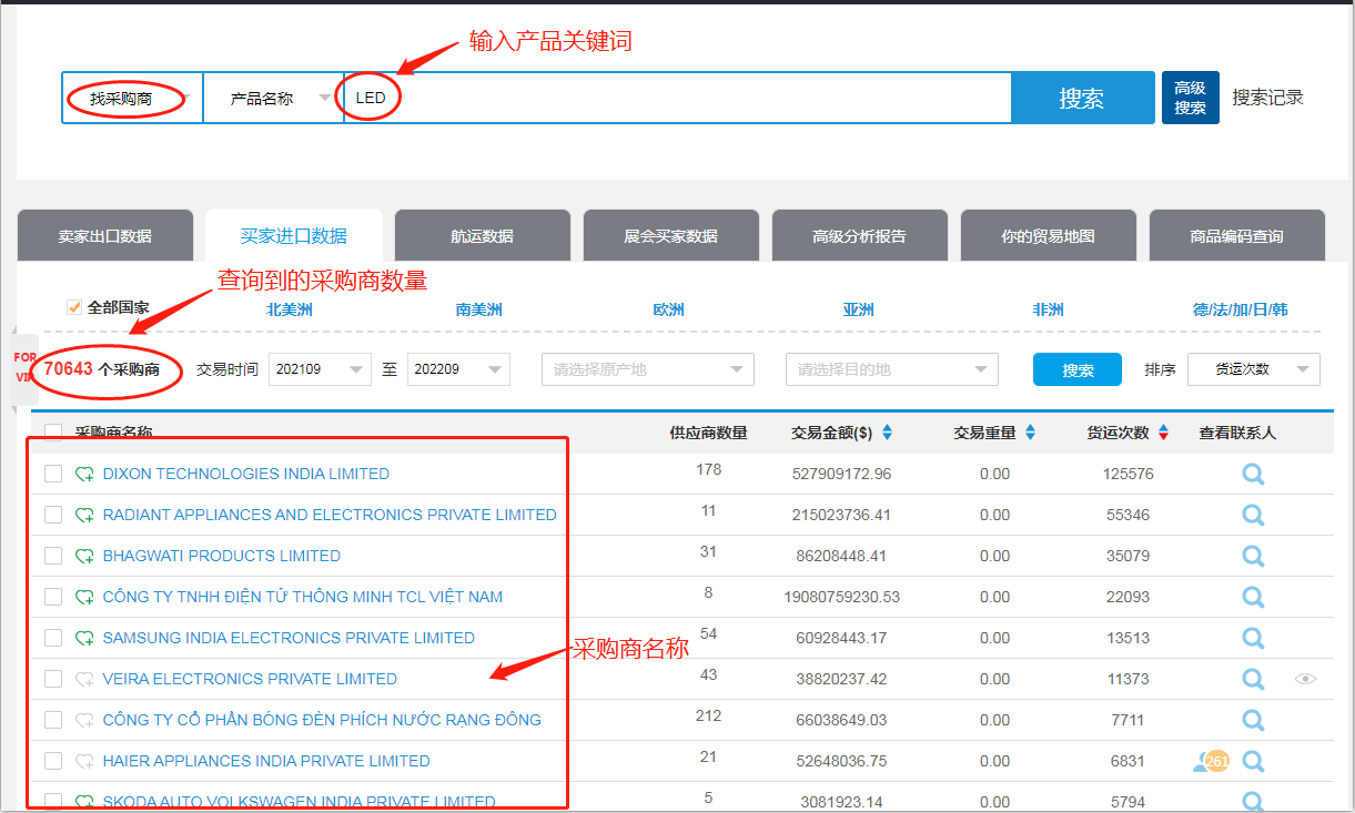第一步,进入找采购商,输入产品关键词,如:LED。我们可以查询到近一年一共有70643个采购商的信息,可以根据需要,自由设置起始时间。