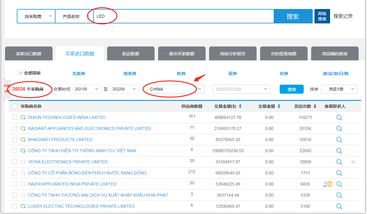 也可以选择原产地“China”,查询跟中国有交易的采购商数据