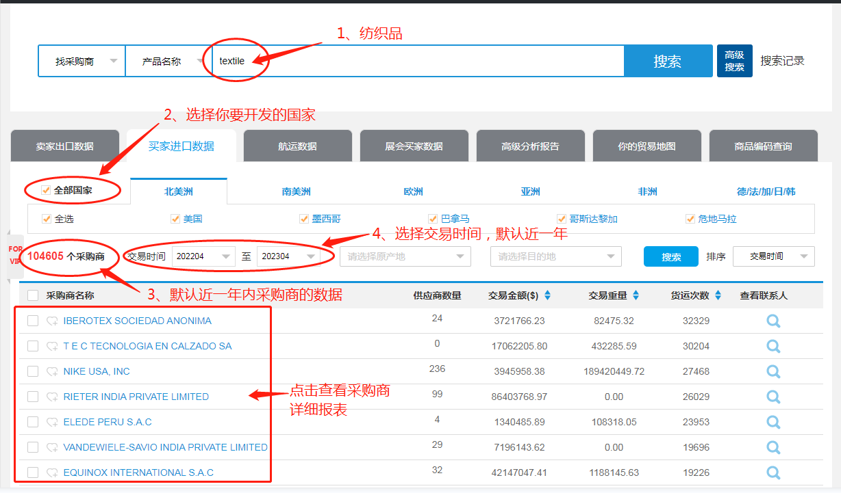 输入产品关键词如纺织品“textile”,可获取近一年全球采购过纺织品有104605 条交易数据;(也可以单单勾选英国,查看英国的采购商)