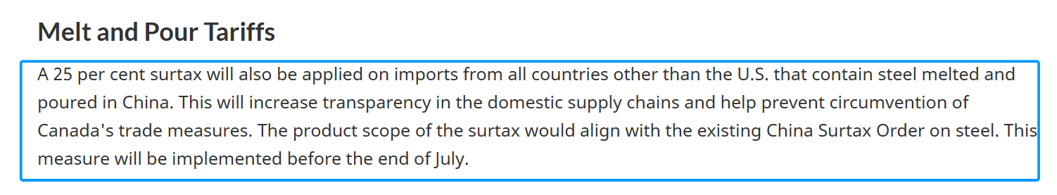值得注意的是,加拿大还宣布,对所有含中国熔炼和浇铸钢材的进口产品(美国除外),也将加征25%附加税,并称这将提高国内供应链的透明度,并有助于防止规避加拿大的贸易措施。