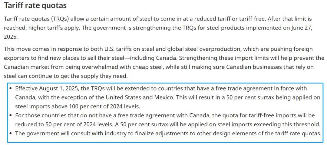 01、自2025年8月1日起,关税配额将扩大至与加拿大签订生效自由贸易协定的国家,但美国和墨西哥除外。对于超出2024年进口量100%的钢铁进口,将征收50%附加税。