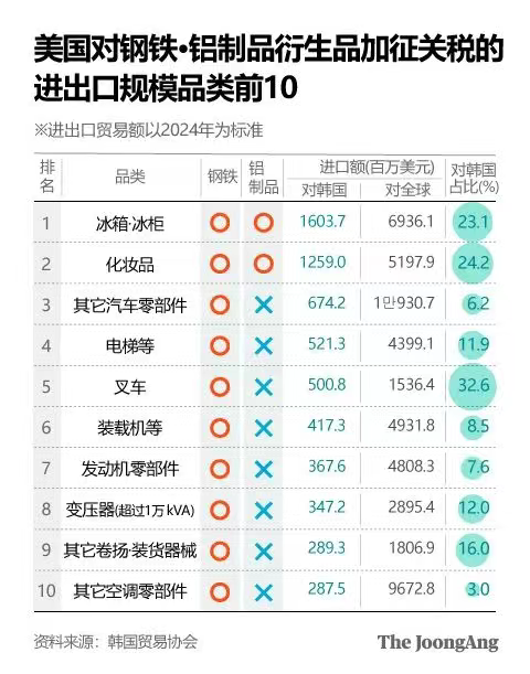 美国对钢铁和铝产品征收高达50%的品目关税,如今在征税品类中又继续公布了407种钢铁、铝衍生产品。也就是说,对用于商品的铁、铝的成本征收50%的关税。家电、变压器、涡轮机、发动机、工程机械等对美出口占比高的品类被大批列入清单。韩国一年出口美国的这类商品出口额达16万亿韩元,韩国企业恐将遭受更多的损失。