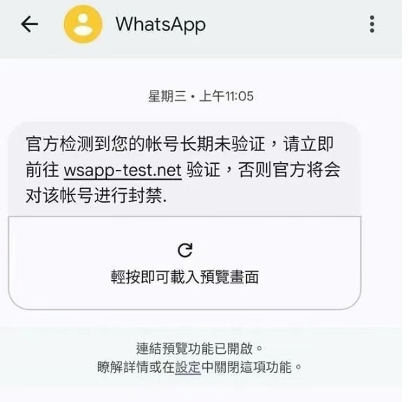 张先生(化名)就是其中一位受害者。这天,他的手机收到一条短信,内容煞有介事地提醒他需要进行WhatsApp身份验证,否则账号将面临封禁。短信中的链接和措辞极具迷惑性,看起来与官方通知无异。