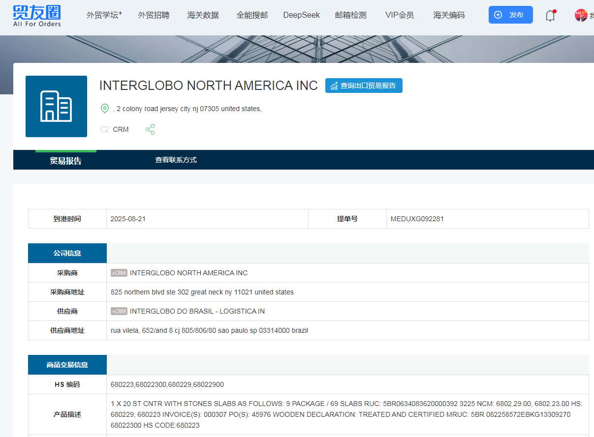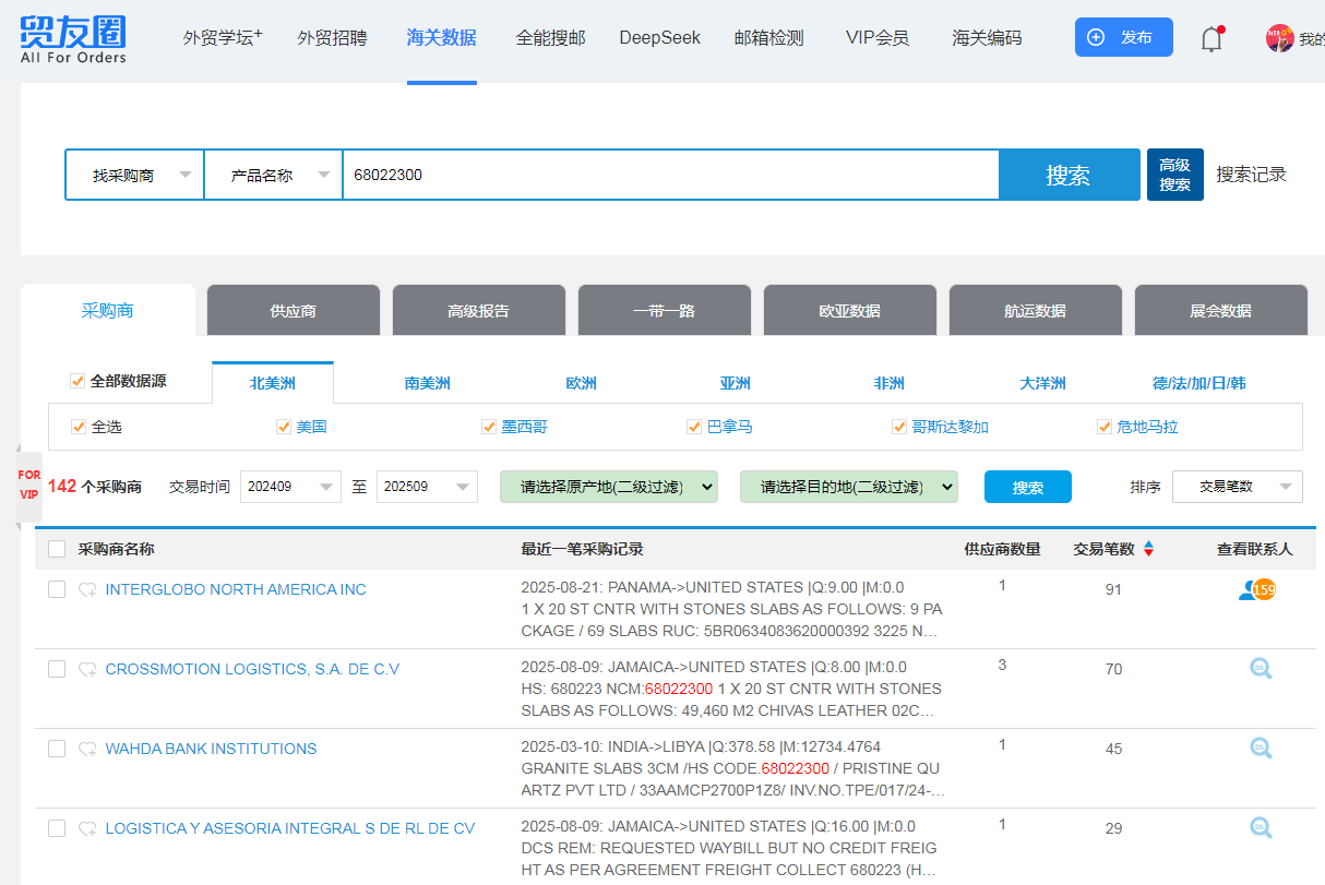 如果您是石材供应商: 搜索美国HS编码68022300(花岗岩制品)的进口商,得到的结果会非常精准,因为产品标准、统一。